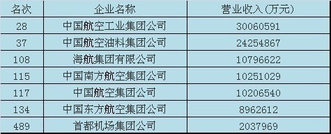 海航集團(tuán)有限公司以1079.6億元的營(yíng)收位列108名,中國(guó)南方航空集團(tuán)公司以1025.1億元的營(yíng)收居115位,中國(guó)航空集團(tuán)公司以1020.6億元的營(yíng)收排在第117位,中國(guó)東方航空集團(tuán)公司以896.2億元的營(yíng)收排在第134位。首都機(jī)場(chǎng)集團(tuán)公司以203.7億元的營(yíng)收排在第489位。