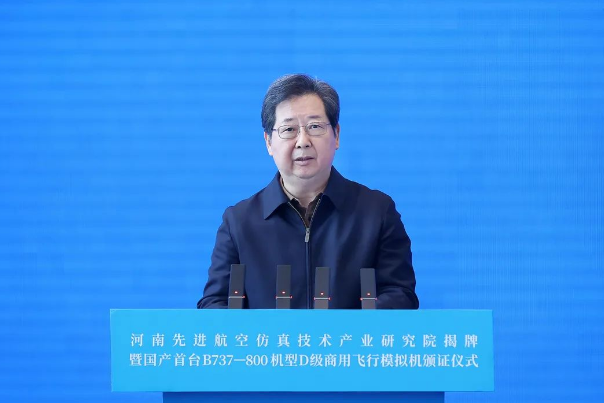 11月26日,河南先進航空仿真技術(shù)產(chǎn)業(yè)研究院揭牌暨國產(chǎn)首臺B737-800機型D級商用飛行模擬機頒證儀式在航空港區(qū)舉行。省委書記樓陽生出席并講話。