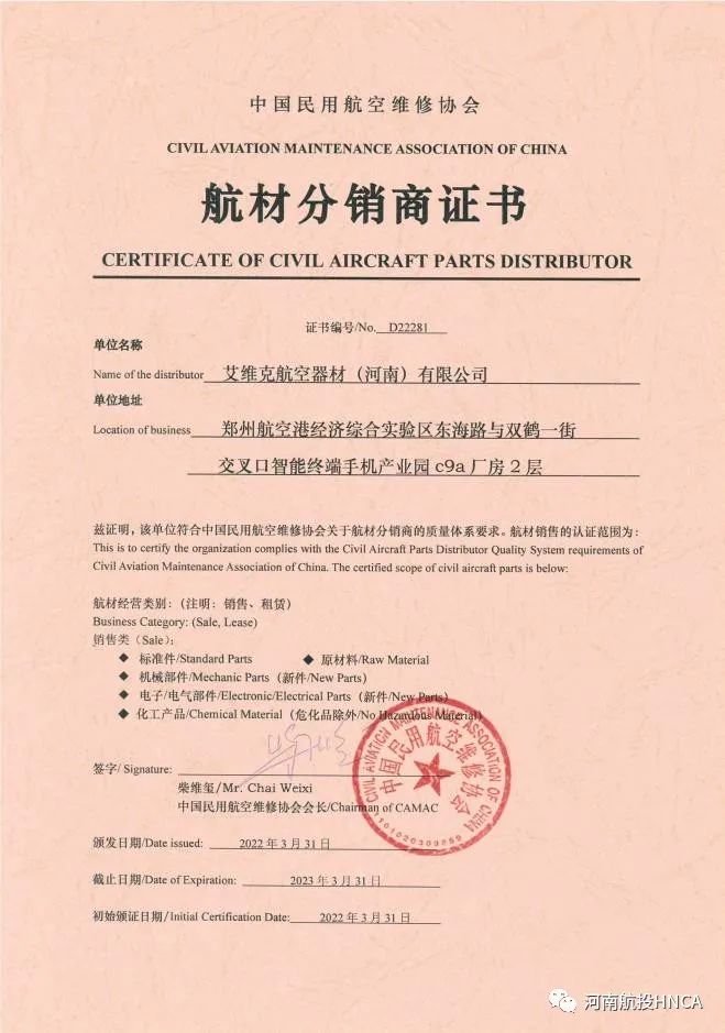 07 河南首家 填補(bǔ)空白 艾維克河南公司取得《航材分銷商證書》