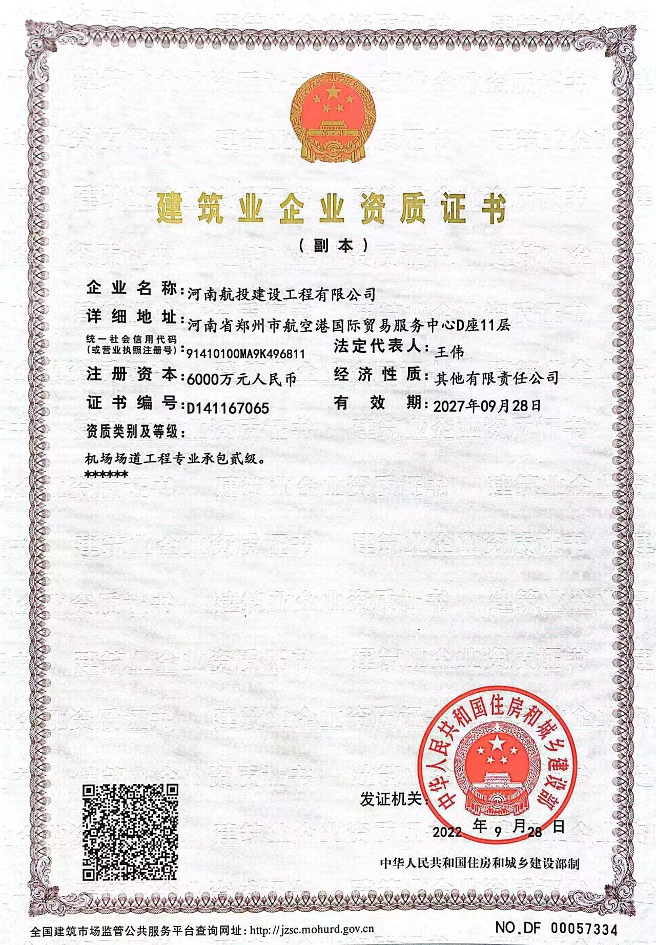 航投建工由河南航投集團(tuán)旗下河南航投航空基礎(chǔ)產(chǎn)業(yè)發(fā)展有限公司與貴州省場道工程有限公司共同出資成立。2022年9月28日,航投建工成功取得機(jī)場場道工程專業(yè)承包二級資質(zhì);同年12月8日通過河南省住建廳各項(xiàng)審核,取得《建筑施工企業(yè)安全生產(chǎn)許可證》,完成參與市場競爭的全部前置條件;12月23日,被評為鄭州航空港經(jīng)濟(jì)綜合實(shí)驗(yàn)區(qū)建筑業(yè)重點(diǎn)培育企業(yè),為施工總承包及多項(xiàng)專業(yè)資質(zhì)的取得打下堅(jiān)實(shí)基礎(chǔ)。